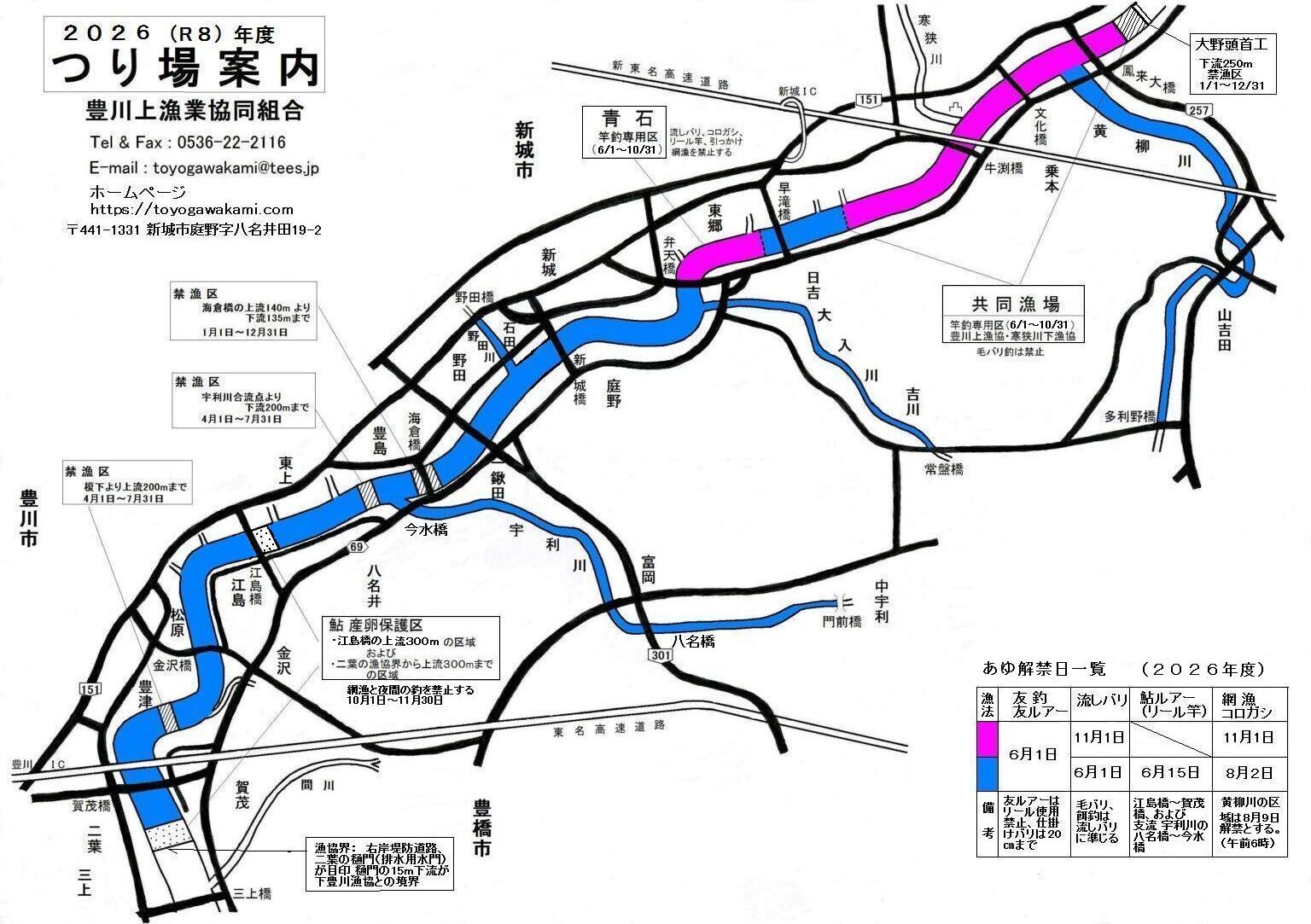 ②禁漁区は、大野頭首工堰堤の下流250mの宇連川の区間、牟呂松原頭首工堰堤の上流140m~下流135mの本川区間(通年)